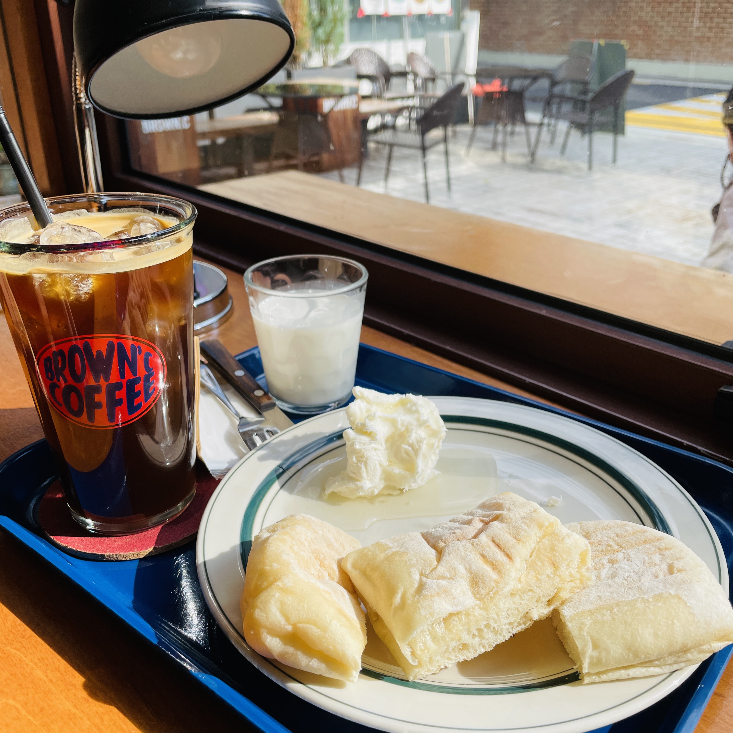 '카이막'을 판매하는 곳으로 포지셔닝되어 있지만, '브라운씨'는 반려견 동반이 가능한, 브런치 카페다. 본디 이런 포지션의 공간은 한번 자리잡고 오랜 시간 본인의 작업하는 사람들이 가득차 있는 공간이지만.. 동네 특성 때문인지 아주머니들이 삼삼오오 높여 데시벨 경쟁을 하는 곳이 되어버렸다. 이런 아주머니들과 경쟁이라도 하듯, 매장 내 음악소리도 상당히 큰 편인데 특히 베이스가 너무 강조되어 있어 소리에 예민한 사람이라면 불편함을 느낄수도 있겠다는 생각.