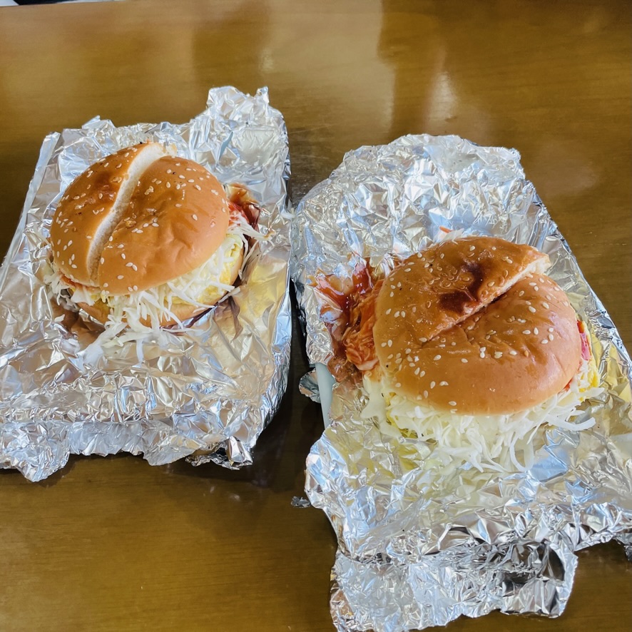 참깨빵에 패티, 계란후라이와 양배추 샐러드.