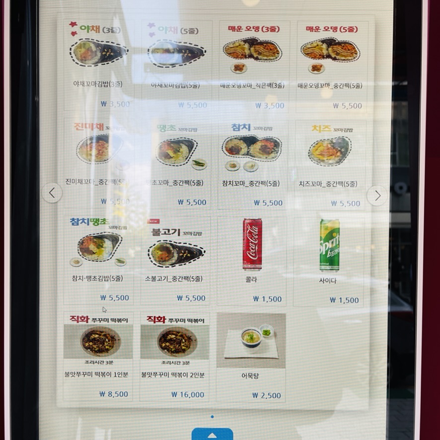 메뉴 주문은 키오스크를 통해 주문을 하면 되는데, 생각보다 다양한 종류의 김밥을 판매하는 것은 아니지만 사람들이 선호할만한 구색은 잘 갖추고 있다. 1인분 기준으로 꼬마김밥 5줄이면 한끼를 해결할 정도로, 말이 꼬마김밥이지만 청소년(?)의 느낌의 가까운 크기라고 보는 것이 적절할 듯하다. 제조시간도 오래 걸리지 않아 갑자기 겨울로 다가서는 지금 추위에 벌벌 떨며 기다리지 않아도 된다는 것은 나름의 장점일까?
