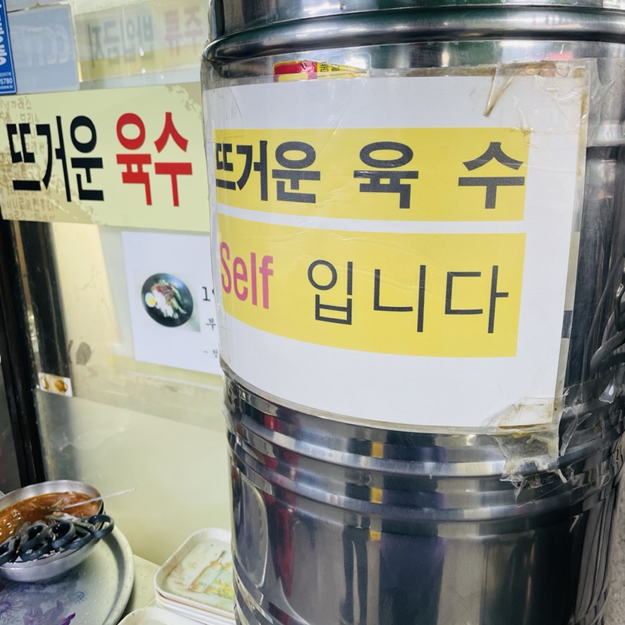 냉면의 첫 맛은 굉장히 달달하다는 인상인데, 아마 무작정 매운맛을 단맛으로 덮어서 점점 매운맛이 올라오는게 아닐까 추측해본다. 맵찔이뿐만 아니라 '맵당당이'이더라도 다대기를 처음부터 다 비비기보다는 한쪽에 덜어두었다가 기호에 맞게 더하는 방법이 조금 더 맛있게 음식을 즐기는 방법이 아닐까 한다. 그래도 다행인 점은 '육수' 인심은 넉넉한 곳이라는 점. 연일 비상을 외치는 입안을 뜨거운 육수로 진압해가면서 먹는 변태스러운 쾌감이 있기 때문에, 가능하다면 온육수와 가까운 자리를 맡는 것이 좋을지도 모른다. (온육수는 Self!)