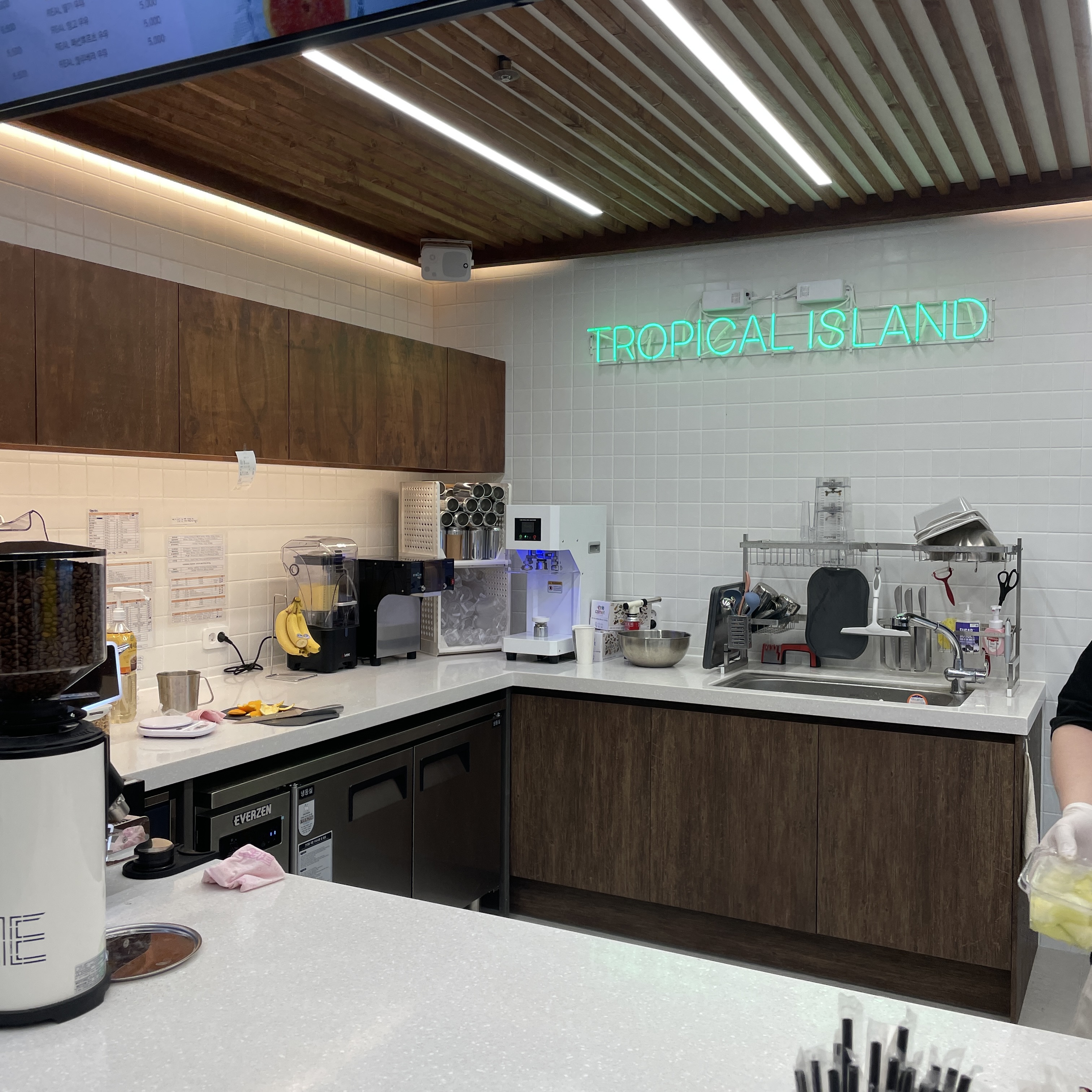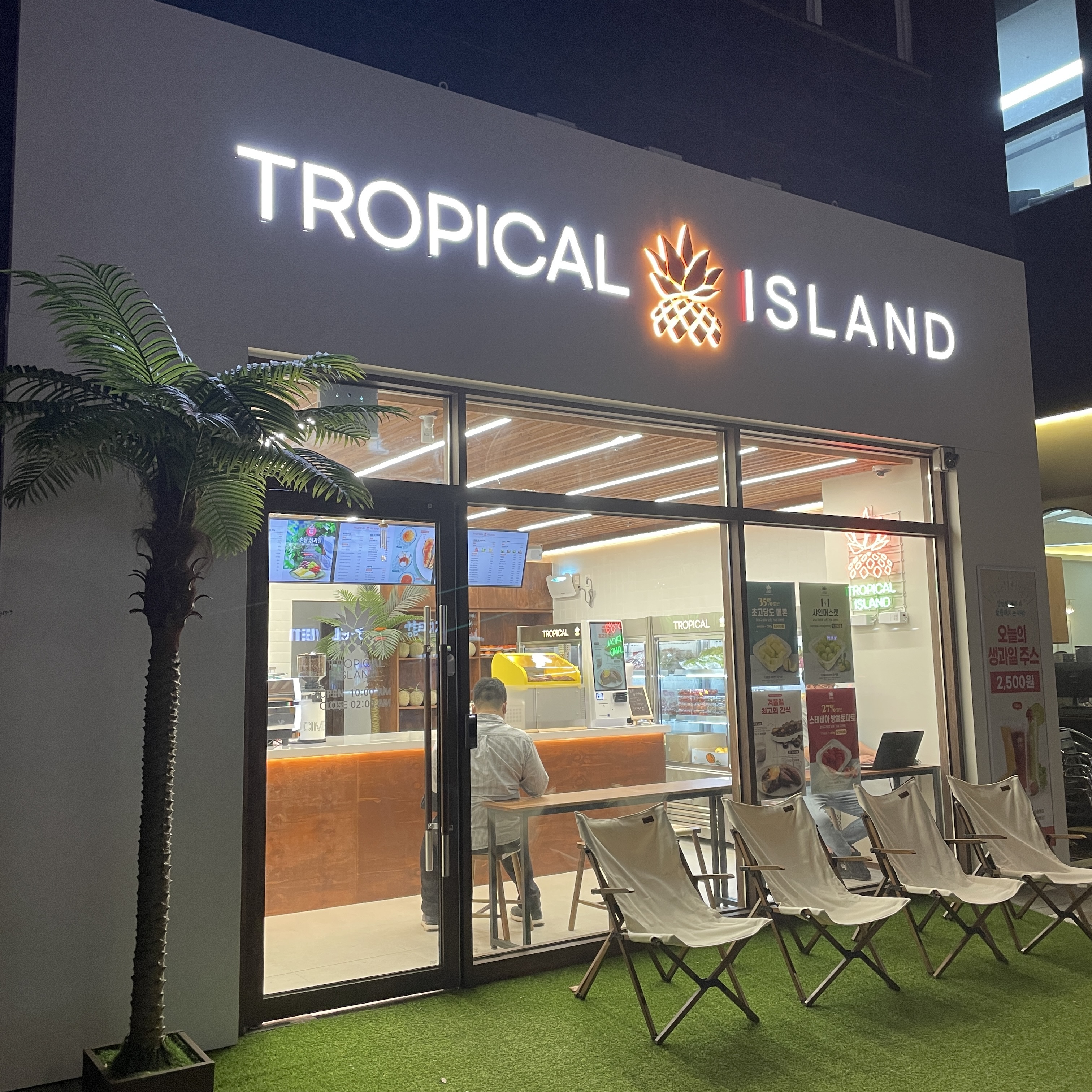 '트로피칼 아일랜드'는 컵과일 전문점으로 보기보다는 과일 주스를 함께 취급하는 과일 카페로 보는 것이 적절하다. 그런 관점에서 가게 앞에 놓인 의자들부터 시작해서 내부의 깔끔한 인테리어까지 굉장히 공을 많이 들인 모습을 발견할 수 있다. 또한 적은 인원으로도 주문을 빨리 쳐낼 수 있는 키오스크 시스템이 있어, 방문하는 손님들을 일일히 신경쓰지 않아도 주문 자체에 집중할 수 있도록 동선이 짜여진 모습.