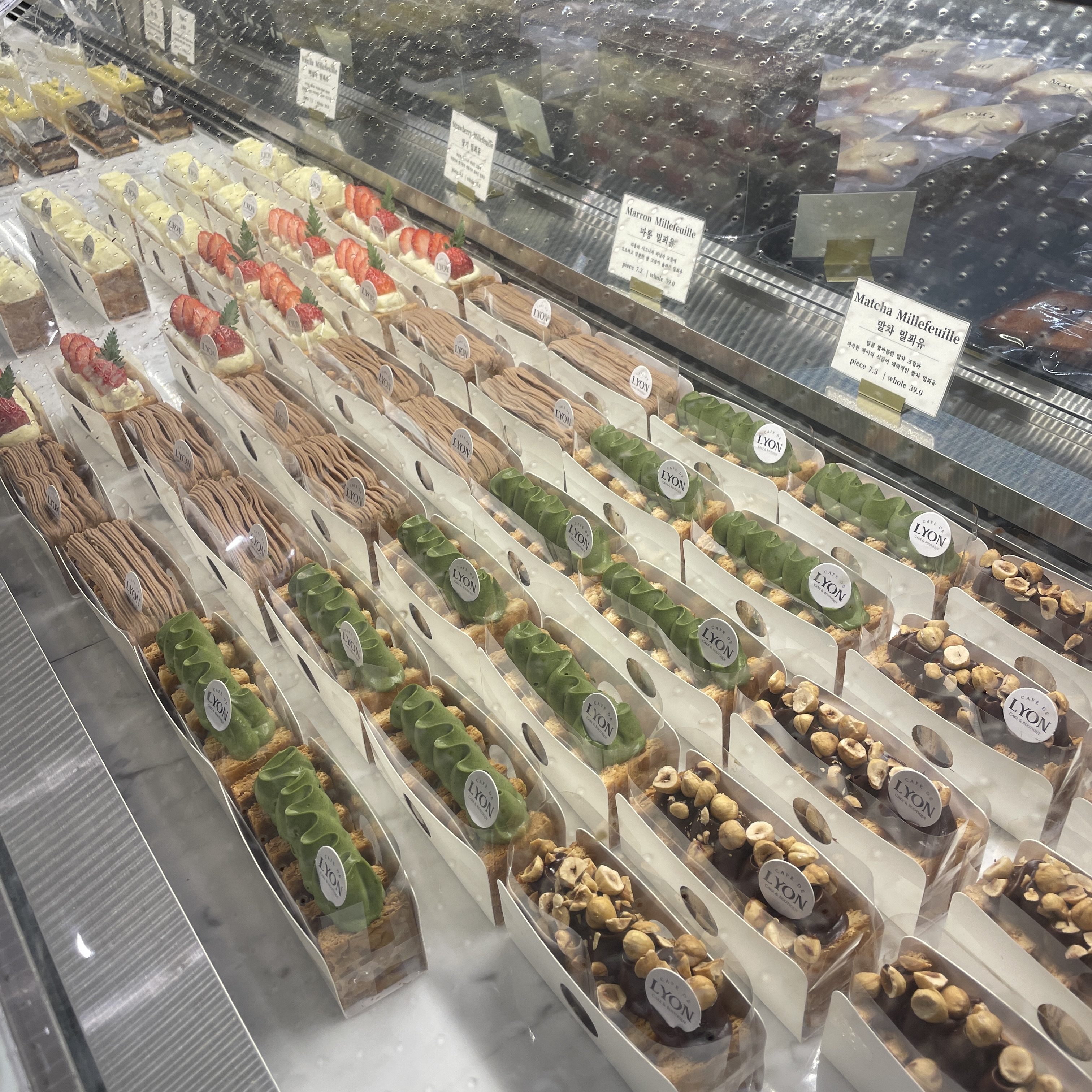 판매를 위해 진열한 모든 디저트들이 맛있을 것 같지만, 디저트 메뉴 중에 이곳을 상징하는 시그니처는 '밀푀유'이다. '천 겹의 잎사귀'라는 뜻을 지닌 '밀푀유'는 여러 겹의 파이 사이에 각종 크림과 과일을 넣어 즐기는 프랑스의 정통 디저트. '카페 드 리옹'에서는 총 4가지의 밀푀유를 선보이는데, 그 중 가장 비주얼적으로 눈에 띄는 밀푀유는 역시 딸기 밀푀유이다.