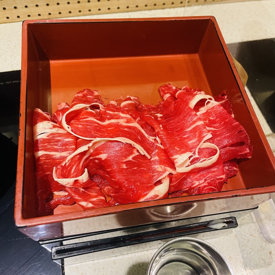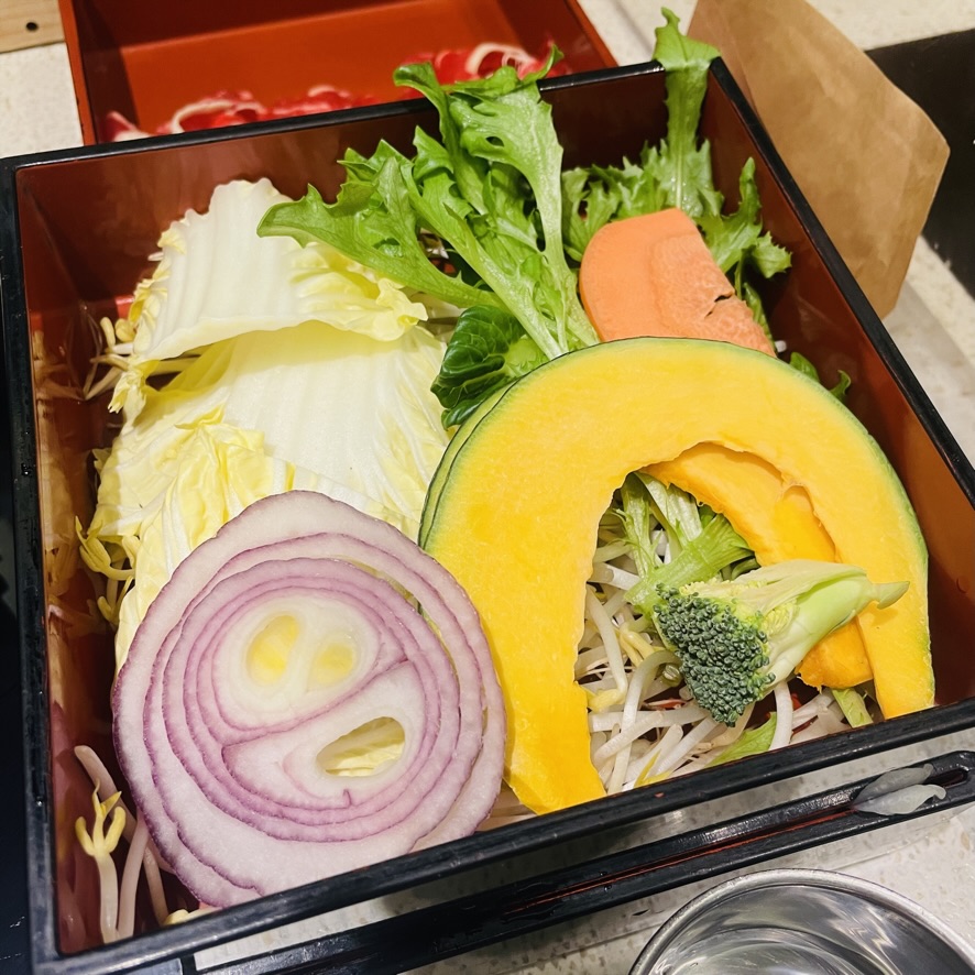 세트메뉴를 시키면 선택한 고기종류(소고기, 돼지고기)와 모듬야채, 그리고 본인의 선택에 따라 죽 or 칼국수로 식사를 구성할 수 있다. 신선한 야채와 아래층에 겹겹히 깔린 고기들은 원한다면 추가로 주문할 수 있지만, 세트로 제공되는 양만으로도 양은 대체로 충분한 편. 인덕션으로 가열하는 구조이기 때문에 상대적으로 육수가 끓어오를 때까지 시간이 좀 걸리는 경우가 있어 인내심을 가져야 한다.